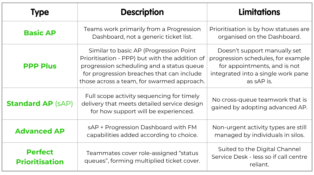 Advanced AP and Perfect Prioritisation combine the base types of AP - sAP, PPP Plus, or basic AP - with a Progression Dashboard and optionally, advanced Flow Management capabilities, to reach a target level of operational maturity. Their combination with any of the three base types means that depending on which service tool is used and an organisation's operational objectives, there are nine types to choose from.